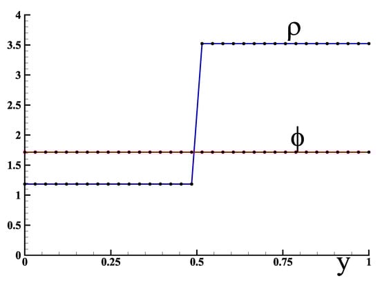 Evolutions of the density and of the scalar potential as a function of the vertical coordinate y for a time s and an injection velocity = −0.01 m s for a mesh of cells.