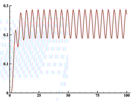The elastic structure density is = 500 kg m, the Young’s modulus is E = 250 Pa and the Poisson coefficient is . The fluid is considered as incompressible. Neumann boundary conditions are imposed on the two holes localized at the top of the vertical walls. As we resolve at the same time the velocity field and the displacement field in the fluid and the elastic membrane, respectively, using a fixed grid, we have to take a relatively large thickness for the membrane (2% of the cavity length) compared to other simulations of the literature, in order prevent a use of a very fine grid. The solution is obtained from zero fields from the system of Equation (5).