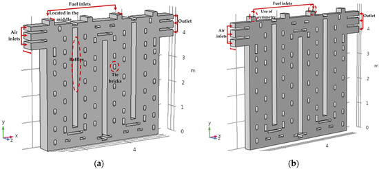 Illustration of the two geometries used for representing the z-component of the single section of an anode baking furnace (ABF). (a) Geometry 1: a full representation of the z-axis; (b) Geometry 2: a half representation of the z-axis.