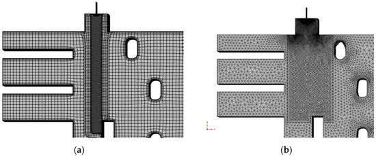 Magnifications of the fuel inlet zones in meshes 2 and 3 are presented in Figure 4. Mesh 2 has a refinement along the fuel jet stream, in Figure 4a, whilst mesh 3 has a refinement at the whole combustion zone—where air inlet and fuel inlet meet—mainly at the leftmost top zone, in Figure 4b.