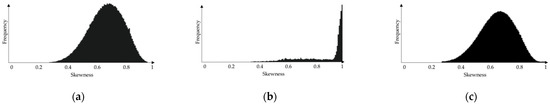 Histograms of skewness quality measures: (a) Mesh 1 generated from geometry 1; (b) Mesh 2 generated from geometry 2; (c) Mesh 3 generated from geometry 2.