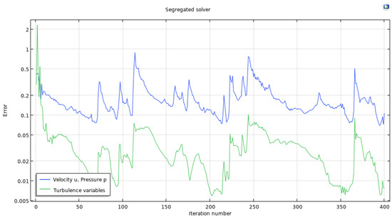 Model 9: uses mesh 2 and sets the results of model 8 as the initial values for the Newton Raphson method. The lowest error value reached is 2 × 10−2 for the velocity-pressure variables and 5 × 10−3 for κ, ε. Figure 12 shows the velocity slide plot at the iteration with the lowest error value reached and the convergence solver plot. There is an increment of the velocity in all locations compared to model 8. Figure 12a shows the flow stream penetrating with high velocities in ever deeper locations. After 400 iterations, model 9 has not achieved convergence, with a minimum error of 10−2. Using an approximate solution as the initial value, without false linearity, is still useful for complex studies.