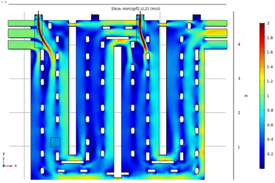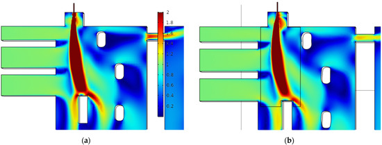 On the other hand, there is a stronger high-velocity fuel stream in the right part, in Figure 11a, that is better represented by model 8. Thus, it produces a better flow velocity uniformity in the second and the fourth subsections of the ABF—where the flow goes up.