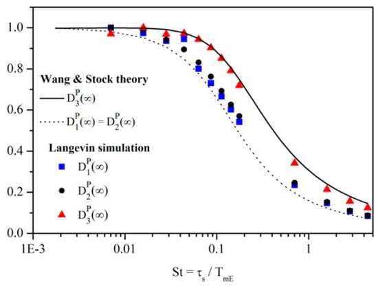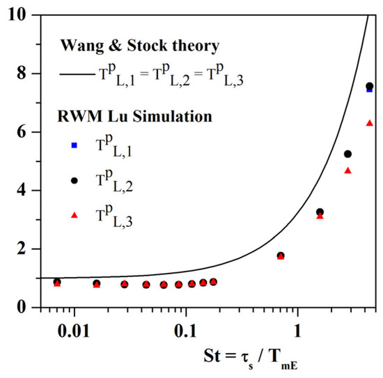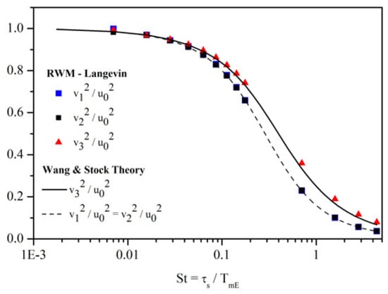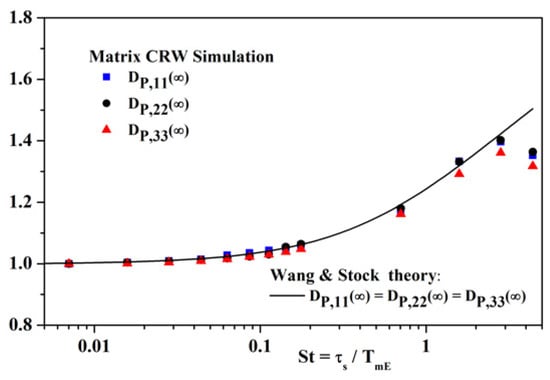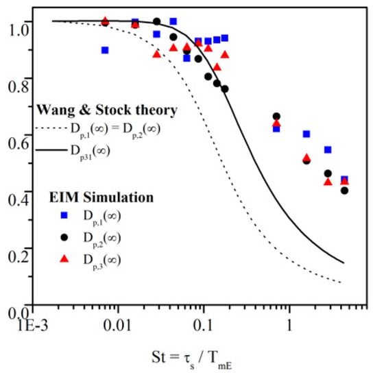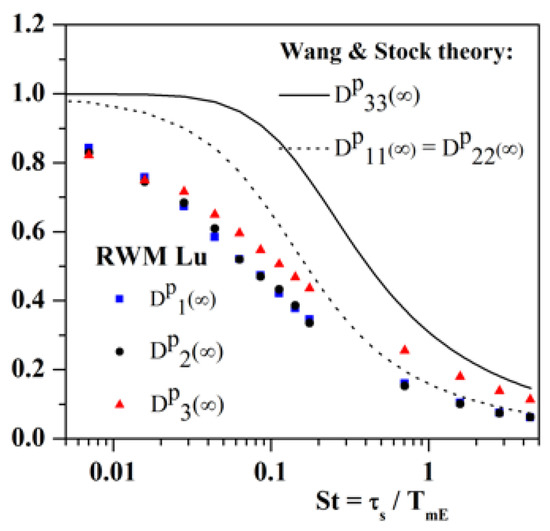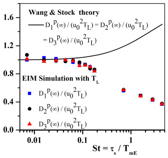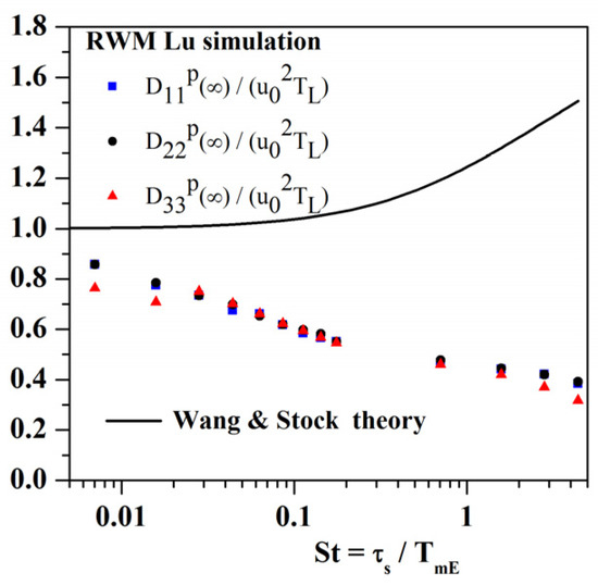 Early studies [47,48] on turbulent diffusion in the atmosphere demonstrated that heavy particles do not move surrounded by the same fluid particle. When they fall, they cross many turbulent structures and therefore move from eddy to eddy. The concept of slip fluid–particle velocity or overshooting was thereby introduced in order to describe the deterministic gravitational drift drawing particles out of the strongly correlated fluid environment and thereby reducing the particle diffusivity, as will be shown.