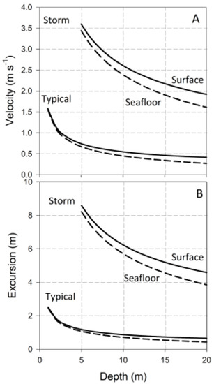Velocity and water-particle excursions in ocean waves: (A) Horizontal velocity as a function of water-column depth for two representative wave conditions; (B) Horizontal excursions.