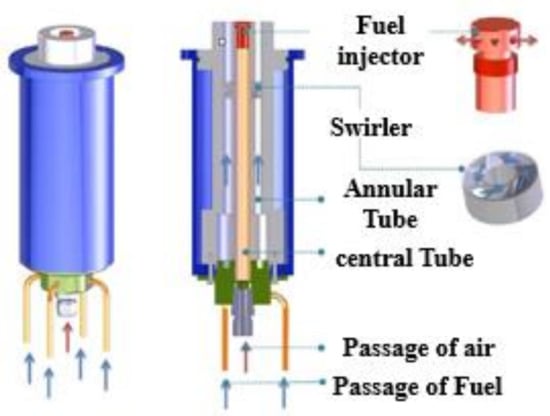 - Yılmaz, I. Effect of swirl number on combustion characteristics in a natural gas diffusion flame. J. Energy Resour. Technol. 2013, 135, 042204. [Google Scholar] [CrossRef]