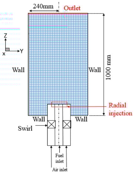 Figure 2 presents a schematic view of the numerical domain. The physical system includes the coaxial burner and the combustion chamber. The simulation is performed using the three-dimensional ANSYS-Fluent 16 code [], in which the equations are solved by the finite volume method applied on a 4 million hexahedral mesh. The grid used was refined close to the burner exit to get more information in the reaction zone. Since we used a very fine mesh, the result remained unchanged beyond 4 million cells.