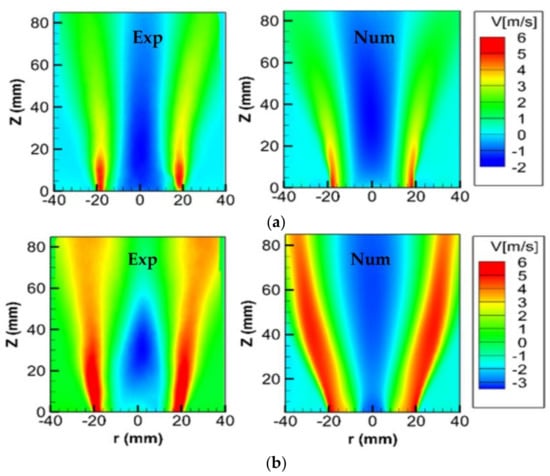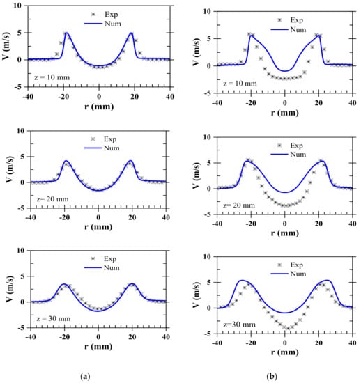 In order to validate the computational models, the numerical results of the mean axial and tangential velocity in non-reactive and reactive case were compared with the experimental data obtained in the same conditions. Figure 3 shows the radial profile of mean axial velocity under non−reacting and reacting conditions at several levels downstream of the burner exit. The results show that the trends of the axial velocity profile were similar under non-reacting and reacting cases. The central recirculation zone (CRZ) and the swirl jet, which are represented respectively by the minimum and the maximum of the velocity value, were well captured. For the isothermal case, the numerical results predicted the value of the maximum and minimum velocity in all locations. For the reacting case, the peak value of the mean axial velocity was well captured at Z = 10 mm and Z = 20 mm. However, the prediction of CRZ was competitive. The difference between the numerical results and the SPIV results were due to the turbulence model. Figure 4 presents the contours of the mean axial velocity for non-reacting and reacting cases. The results are presented in the (x, z) plane downstream the burner exit. The predicted and measured mean axial velocity fields were qualitatively similar and the swirling flow behavior was well captured. It was characterized by the presence of a CRZ. According to these results, it can be seen that for the non−reacting case (Figure 4a), a good agreement was achieved. The value of negative velocity, which represents the CRZ, was around −2 m/s. For the reacting case (Figure 4b), the experimental results show that the presence of the flame considerably affected the CRZ. The flame increased the CRZ width and decreased its length. Contrary to the experimental results, the presence of the flame did not affect the CRZ length for the numerical results but led to a decrease in its width in the burner exit. This can be explained by the effect of the flame and the use of a two−step mechanism, which cannot describe the full chemical reaction of CH4, thus it alters the CRZ. Nogenmyr et al. [] has demonstrated that the complexity of the combustion kinetics affects the degree of agreement between the numerical and experimental reacting flows. The discrepancy between simulation and measurements (Figure 3b) can also be explained by the effect of the presence of the flame, which leads to an important gradient of temperature. Thermal agitation is very important around the reaction zone and the velocity of the flow changes considerably in this region.