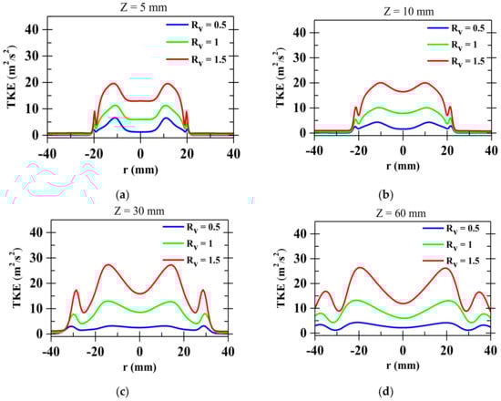 Figure 7 shows the contours of turbulent kinetic energy obtained for three different velocity ratios, Rv = 0.5, Rv = 1 and R v = 1.5. The plots show that the TKE increases by increasing the velocity ratio. The turbulent kinetic energy reaches its maximum at the region of the swirl jet. Figure 8a–c represents the profile of this parameter for three velocity ratios at different locations downstream of the burner exit (Z = 5, 10, 30 and 60 mm). By increasing the velocity ratio, the TKE profile displays the same behavior at the different locations. It can be seen that the maximum TKE value was reached for a velocity ratio of 1.5.