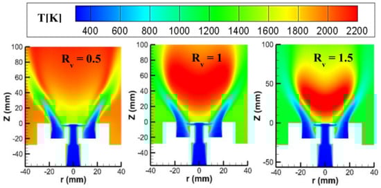 Figure 9 illustrates the temperature distribution as a function of the velocity ratio. For the three cases, the flame had a hot core that extended radially as z increased, surrounded by a relatively cooler reaction zone that separated the flame core from the outside environment. At a low velocity ratio (Rv = 0.5), the flame temperature extended into a large area in the computational domain. Figure 9 also shows that the augmentation of the inlet air velocity decreased the flame length and enhanced its stability.