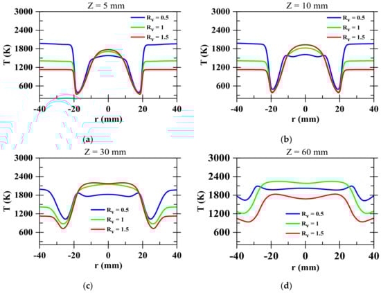 Figure 10 shows the profiles of temperature distribution T (K) for three velocity ratios at different locations, Z = 5 mm, Z = 10 mm, Z = 30 mm and Z = 60 mm. If the air velocity increases along with the increase of the velocity ratio, the temperature in the reaction zone increases. For example, at Z = 30 mm, the flame core was at 1800 K in the case of Rv = 0.5, whereas for Rv = 1.5, the temperature exceeded 2200 K. The addition of air quantity decreased the flame length. It can be seen in Figure 9 that the flame moved to the burner exit when the velocity ratio increased. In addition, the reaction zone was reduced in volume as the velocity ratio increased, which is similar to the decrease in the global equivalence ratio when the velocity of air increases.
