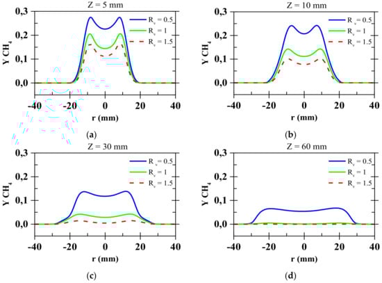Figure 11 shows the radial numerical profiles of the methane mass fraction obtained for different velocity ratios and presented at three locations downstream of the burner exit (Z = 5 mm, Z = 10 mm, Z = 30 mm and Z = 60 mm). The mass fraction of the methane presented a maximum on the burner axis (−10 < r < 10). The mass fraction decreased when the radial position r increased and moved toward zero away from the burner center. It can be seen that the maximum mass fraction of the fuel decreased when the quantity of oxygen increased, along with an increase in the velocity ratio. For a low velocity ratio (Rv = 0.5) and at a position near the burner exit (Z = 10mm), the mass fraction of the fuel was equal to 0.15 at r = 15 mm. At the same location and for a velocity ratio of 1.5, the fuel mass fraction was equal to 0.1. Figure 11 represents the variation in the fuel mass fraction obtained for three different velocity ratios and for different heights. It can be seen that with different velocity ratios the quantity of CH4 consumed by the combustion reaction depended on the reaction zone displacement. At Z = 60 mm (Figure 11c) the maximum mass fraction equaled 0.018 for Rv = 0.5 and equaled zero for Rv = 1 and Rv = 1.5. This means that at a distance of 60 mm downstream of the burner exit, the methane was completely consumed by the combustion reaction.