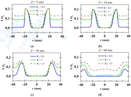 Figure 12 shows the obtained radial profiles of the oxygen mass fractions at different heights (5 mm, 10 mm, 30 mm and 60 mm downstream of the burner exit). The highest mass fraction of O2 was located at the swirl jet (at r = −20 mm and r = 20 mm). Near the burner exit (Figure 12a), the variation in the mass fraction of the oxygen presents a minimum at the radial position of r between −10 mm and 10 mm, which represents the reactive zone, where the mixing between the fuel and the air is nearly in balance. At Z = 30 mm (Figure 12b), the radial position of the maximum increases when the velocity ratio increases. Thus, the flame becomes thinner by the addition of air. Moving away from the burner exit, at Z = 60 mm (Figure 12c) the mass fraction of the oxygen value is around zero in the flame zone for Rv = 0.5 and Rv = 1, indicating that the quantity of oxygen injected by the burner is completely consumed by the reaction. For Rv = 1.5, it can be seen that the mass fraction of the oxygen in the reactive zone is around 0.1.