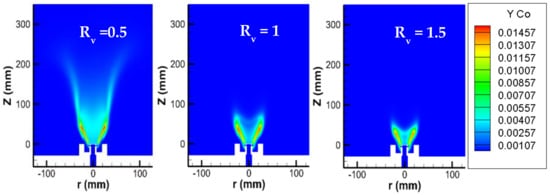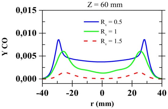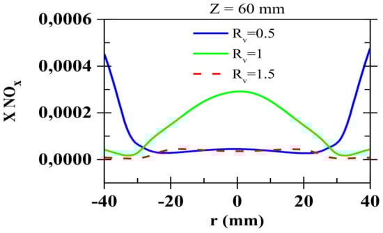 Figure 15 displays the obtained radial profiles of the NOx mole fraction for different velocity ratios at Z = 60 mm. The distribution of the NOx fraction also depends on the velocity ratio. For Rv = 1 and Rv = 1.5, the maximum NOx concentrations are shown in the reaction zone. The main parameter that affects the NOx emission is the temperature. If the velocity ratio increases from Rv = 0.5 to Rv = 1, the NOx emission increases. This augmentation can be explained by the increases in flame temperature (Figure 10) via the thermal NO mechanism. The highest velocity ratio (Rv = 1.5) causes a decrease in NOx formation because of the decrease in the temperature value in the flame zone at Z = 60 mm (Figure 10c).