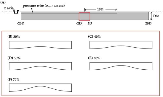 A schematic illustration of ideal models inserted with a pressure wire. (B–F) are zoom-in views of stenosis locating at −2D to 2D in the coordinate. (A) represents the non-stenosed (pipe) case, while (B–F) represent the stenotic domains of 30, 40, 50, 60, 70% DS models, respectively.