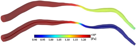 A patient-specific case with moderate stenosis has also been studied. The value of Pd in the non-wire model is 10,927 Pa, while it decreases to 8855 Pa in the wire-included model, respectively (Figure 4). A larger pressure drop between wire-absent and wire-included models is observed in the patient-specific case compared with the ideal models. There are two causes. Firstly, in the cardiovascular system, the downstream arterial diameter usually becomes smaller even though a stenosis is not present and the individual is healthy, as can be demonstrated in the geometry in Figure 2—the outlet diameter is smaller than the upstream arterial diameter. A reduced diameter downstream of the vessel may accelerate the decrease of the pressure [24]. Secondly, pressure reduces due to the aforementioned flow obstructive effect caused by the pressure wire.