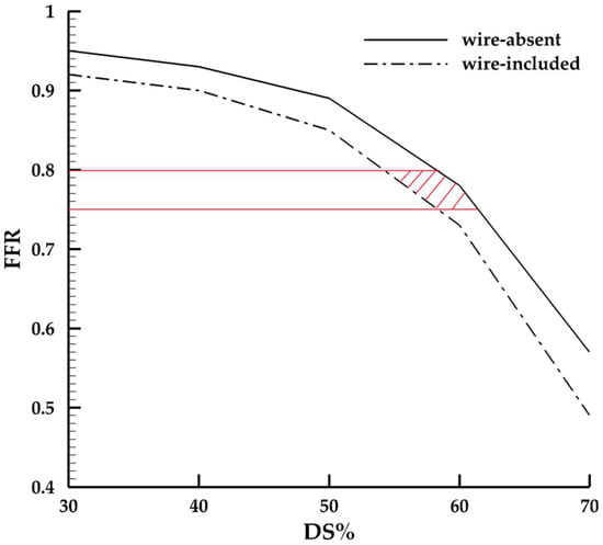 The cut-off value of FFR is 0.75 based on the clinical statistics analysis [26], yet cardiologists may elect to perform PCI when FFR detected is between 0.75 to 0.80 if the clinical scenario suggests ischemia [27]. In the intermediate stenosis from 50 to 60% ideal stenotic cases, FFR predicted may be greater than 0.8 in a wire-absent model, and it may drop to the “gray zone” if the impact of the pressure wire is considered in the CFD study, as is showed near the red region in Figure 5. That makes it problematic for clinical decisions and may result in a false evaluation when the value of FFR is non-invasively predicted. Furthermore, in the patient-specific intermediate case, a value of FFR as 0.88 certainly indicates a non-significant ischemia clinically. However, the value of 0.71 in the simulated model with a pressure wire inserted indicates a functionally significant stenosis, and further intervention may be considered. While uncertainties resulted from the current simulation strategies [28] may lead to a deviation of the virtual FFR compared with the physiological situation, the difference of FFR in patient-specific models reveals that the pressure wire has an overestimation impact on evaluating intermediate coronary artery in CFD studies.