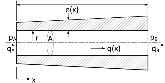 This paper describes an analytical solution for pressure and flow dynamics for laminar liquid flow within a circular tube with constant inner diameter and varying wave propagation speed along its length, as shown in Figure 1. Fluid wave speed inside a non-rigid tube is dependent on the mechanical properties and the geometry of the tube as well as the fluid properties. Considering the pressure wave propagation along a tube, mechanical defects such as erosion, corrosion, and leakage have significant effects on the dynamic response of the pressure and flow. The motivation for this research is the use of such dynamic effects to allow for estimation of the remaining wall thickness in an eroded pipe at a lower cost than existing inspection techniques such as ultrasonic inspection, fiber-optic monitoring or “smart pigs” [1,2,3]. Other applications of this model would include research into water hammer [4], ram pumps [5,6,7], switched inertance hydraulic converters [8,9,10,11] and transient flow measurement [12].