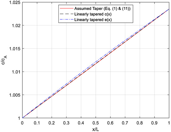 The wave speed profile assumed in Equation (11) results in a wave speed that approximates both the case where the wave speed varies linearly and the case where the tube’s wall thickness varies linearly, as long as the variation in wave speed is small relative to its absolute value. (This example was calculated for E = 200 GPa and K = 1 GPa).