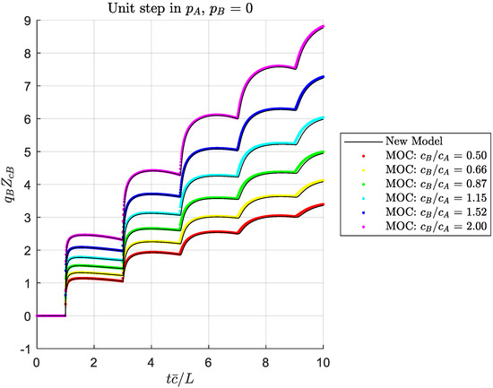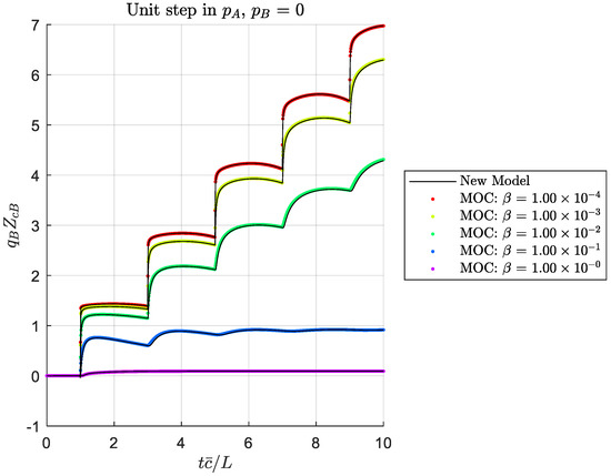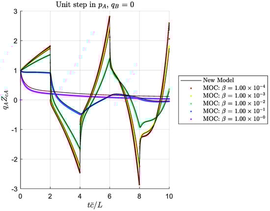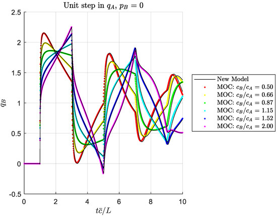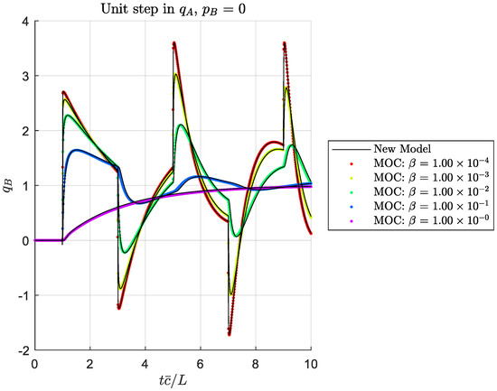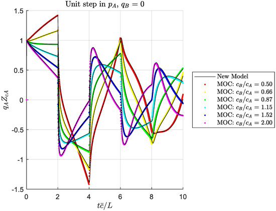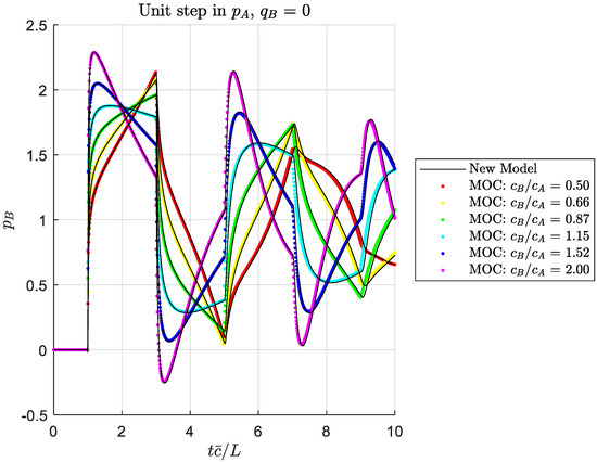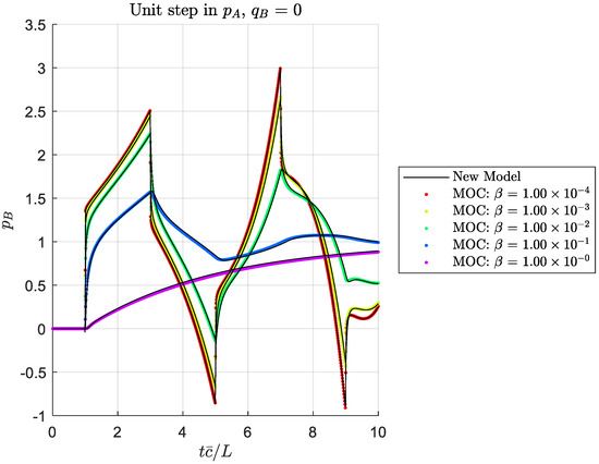 Figure 3, Figure 4, Figure 5, Figure 6, Figure 7, Figure 8, Figure 9 and Figure 10 show solutions for four boundary condition situations, involving all four of the transmission matrix terms. Figure 3, Figure 4, Figure 5 and Figure 6 show the effect of varying the outlet wave speed while holding other parameters constant (which would result in for . The solutions agree well, within the expected accuracy of the MOC solution. Figure 7, Figure 8, Figure 9 and Figure 10 show the same boundary conditions, but now holding constant and varying the viscosity to show a range of dissipation numbers (refer to Equation (37)). Again, the solutions agree well across the range of responses. At this point, we have not identified bounds for the applicability of our solution method, but we expect it should be suitable for all practical situations where the assumptions are satisfied.