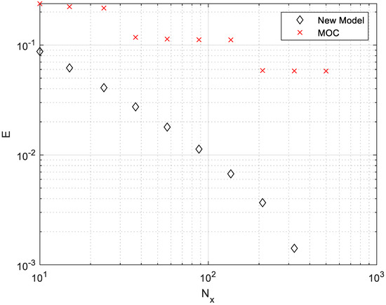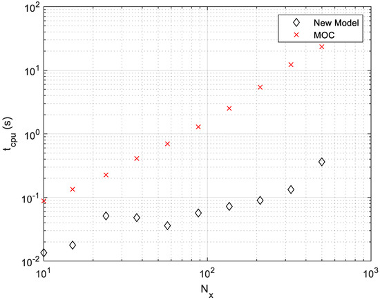 In order to provide a sense of the relative computational cost for the new frequency domain method, responses were calculated for the case of and while varying the number of frequency points in the solution. The method of characteristics solution was then calculated, with the grid selected to give results at the same time resolution. The computation time was recorded for each calculation, as implemented in MATLAB 2019b and run on a desktop computer with a i7-8700 processor with 32 GB RAM. In each case, the solution was calculated to an end time of four times the response’s settling time (defined as the point where transients reduce to 1% of the maximum value). The relative root mean squared error between the calculated response, and the highest resolution frequency-domain method response calculated, , normalized by the standard deviation, was calculated as