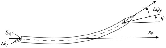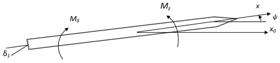 In [29], it is shown how oscillations affect the motion of an aircraft. For example, under the influence of a disturbing moment , the aircraft is deflected by a certain yaw angle . Then, the stabilization machine, turning the steering elements (), will create a control torque , which should compensate the harmful effect of the disturbance (see Figure 2). However, the body of the aircraft, as already mentioned above, is not an absolutely rigid structure, and it will bend under the action of the torque , as a result, the yaw angle sensor, placed on the gyro platform, will register the angle not the angle , but (see Figure 3).