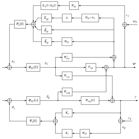 Disregarding the effect of quantization in digital feedback loops of the full model results in “model 2”. By separating the angular motion stabilization system from it, we obtain a block diagram, which is shown in Figure 4. “Model 2” is a continuous two-dimensional stabilization system taking into account the elastic links of the object. If in “model 2” we neglect the mutual influence of the heading and roll channels, we obtain a continuous one-dimensional model of the stabilization system. We will call it “model 3”. The block diagram of “model 3” is shown in Figure 5.