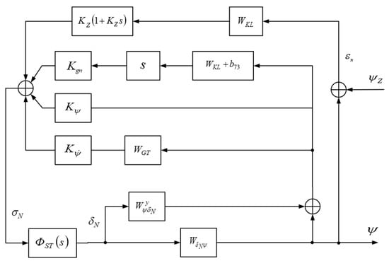 In this figure, is the transfer function of the elastic connection of the object, determined by the equality , —rudder angle.