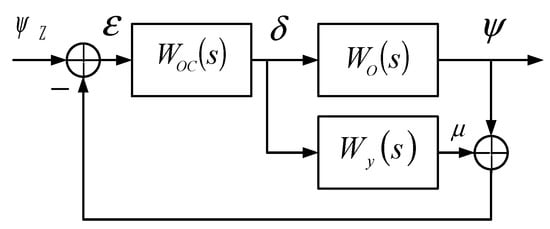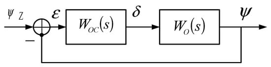 Let us consider the application of the proposed approach, for example, for analyzing the stability of the UAV stabilization loop. By “model 3”, the stabilization circuit of a “rigid” unmanned aerial vehicle can be considered in the form shown in Figure 6. In this figure, ψ—the yaw angle of the vehicle; —the rudder deflection angle; —the specified yaw course angle; and —the stabilization error.