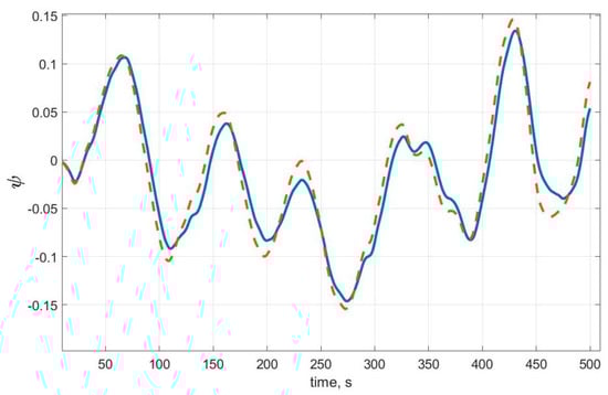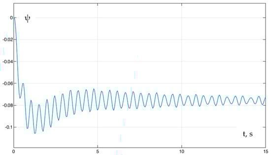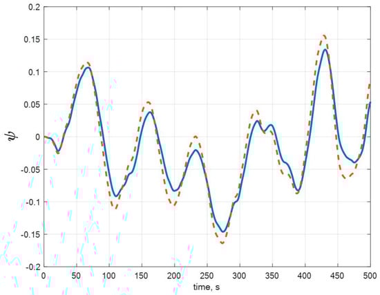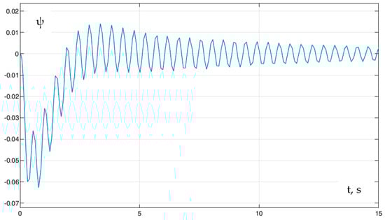 The results of the deviation of the stabilization system from the zero value of the yaw angle are shown in Figure 10. The red (dashed) line indicates the transient process of the UAV heading stabilization system described by the continuous system, and the blue (solid) line—the transient process of the UAV heading stabilization system described by the multi-rate continuous–discrete system. We see that the first system has a higher overshoot.