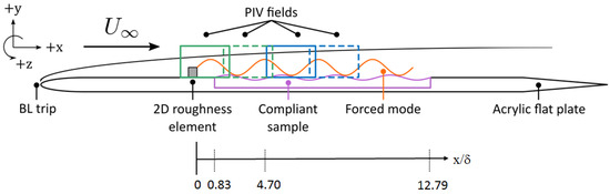 - Huynh, D.; McKeon, B. Measurements of a turbulent boundary layer-compliant surface system in response to targeted, dynamic roughness forcing. Expts. Fluids 2020, 61, 94. [Google Scholar] [CrossRef]