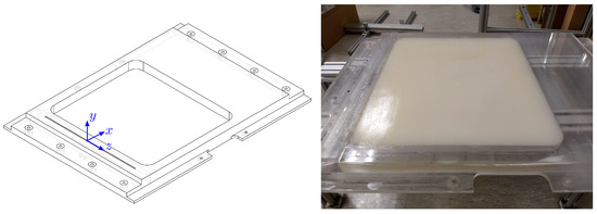 Gelatin was selected as the material for this study due to its low cost, high deformability, and nearly linearly elastic behavior [19]. Because this study sought to compare results with modelled predictions, it was more important to have a measurable surface response to the roughness-forced synthetic mode rather than to achieve a particular performance metric. The gelatin was fabricated using a 1:25 gelatin–water ratio and molded directly into a section of the flat plate. Through simple compression tests, the Young’s modulus of the gelatin was measured to be kPa, and by assuming a Poisson’s ratio of 0.5 as is often used for gelatin [20], the shear modulus and shear wave speed were estimated to be kPa and m/s, respectively. This corresponds to an extremely soft material, though the low freestream velocity ( m/s) relative to the shear wave speed meant that hydroelastic instabilities were not expected. As discussed in Huynh and McKeon (2020), the Rayleigh, generalized Rayleigh, and Love wave speeds were also all calculated to be significantly larger than the freestream velocity, namely 1.15, 1.18, and 1.32 m/s, respectively.