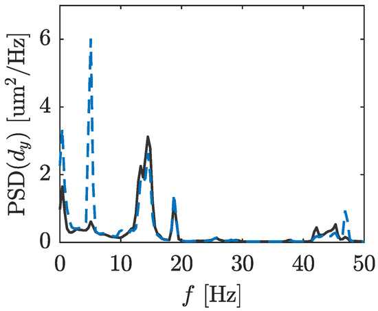 Comparison of the power spectra of the wall-normal deformation, , between the unforced (solid) and forced (dashed) studies. Data correspond to the leading-edge FOV and have been spatially-averaged over x and z.