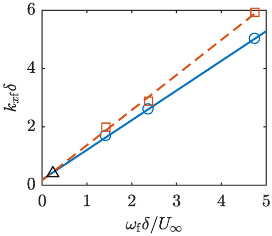 Further leveraging the synthetic input, the component coherent with the forcing frequency, , can be isolated from the velocity and deformation fields. This was done by a straightforward phase-averaging and discrete Fourier transform procedure in time [15]. is used to denote a quantity Fourier transformed in time and subscript indicates that only the () component has been retained. In Figure 5, the phase snapshots (corresponding to the roughness element lying flush with the wall) of the coherent RW-DRF and CW-DRF velocities and CW-DRF wall-normal deformation are presented, all from actuation condition iii. Looking at the velocity modes (a–d), the RW- and CW-DRF data once again compare well with one another. A streamwise periodic structure is immediately apparent in both and , and is seen to convect downstream while gradually decaying and drifting away from the wall. For both the RW and CW modes, undergoes a phase jump in y, while is tall and straight in y. This behavior is consistent with a two-dimensional perturbation. Under close inspection of the velocities near the downstream end of the measurement domain, the CW modes can be seen to lag slightly behind the RW modes. This apparent lag is due to the CW synthetic mode having a shorter streamwise lengthscale. Despite the two-dimensional nature of the mean characteristics of the boundary layer, we define an effective streamwise wavelength, , and effective streamwise wavenumber, , to compare the modes. This can be quantified by approximating the velocity mode as a streamwise-travelling wave and calculating the streamwise derivative of the mode phase to estimate [14]. Figure 6 shows the values calculated for actuation conditions i, ii, and iv, as well as the value for Duvvuri and McKeon [17]. The RW and CW data follow a linear trend over the frequency range explored, highlighted by the lines of best fit plotted alongside them. For all actuation conditions, the CW synthetic mode was found to have a higher value than the RW mode. This may be due to the compliant sample modifying the recirculation region just downstream of the roughness [26] and possibly reducing the convection velocity of the perturbation. Still, the general structure of the synthetic mode does not appear to be greatly affected by the compliant surface.