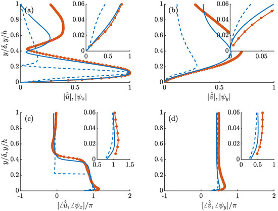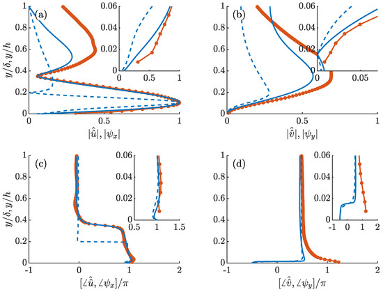 Comparison of the resolvent modes in the (a,c) the streamwise direction , (b,d) wall-normal direction between the rigid wall (blue solid lines) and compliant wall (red dash lines). Figures (a,b) are mode amplitudes, and (c,d) are mode phases. The resolvent parameters are , for both cases. Mode amplitudes are normalized by their peak values, and phases are set to zero at the critical layer. Insets are the near wall close-up views for .