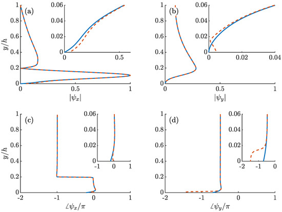 Note that is required to balance a mean shear term introduced by the wall deformation, and that is related to the deformation by the no-through flow boundary condition. Furthermore, Equations (11) and (12) together require that has a phase lead with respect to at the wall.