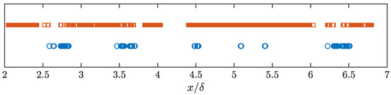 A visualization of the streamwise locations where the near-wall condition is met for the compliant wall experiment (red squares on the top line), and the rigid wall experiment (blue circles on the bottom line).