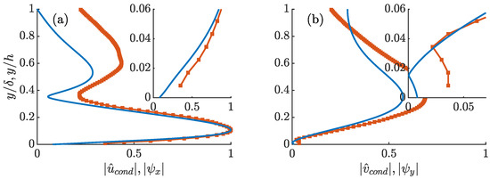 Equation (27) indicates that is the result of the change in forcing mode. From an optimization point of view, the first forcing mode is a unit energy mode that maximizes the energy of . Therefore, as the flow configuration changes, the forcing mode also changes to achieve this maximum. On the other hand, Equation (28) indicates that describes the change in response directly attributed to the change in boundary condition. For the compliant wall case studied here, induces non-zero boundary values in the streamwise and wall-normal directions as a result of the pressure at the wall that deforms the compliant surface.