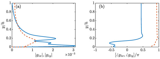 Turning back now to the treatment of the compliant wall boundary condition as a forcing to the rigid wall resolvent system, the amplitude and phase of the component of the boundary forcing for the relevant parameters of the experiment are plotted in Figure 12. As previously explained, the form of is not unique, and is therefore not plotted here. Because the wall with admittance of is close to being rigid, the changes due to the compliant wall boundary conditions are small, as observed previously in Figure 9. As a result, the magnitude of the component of the boundary forcing is very small.