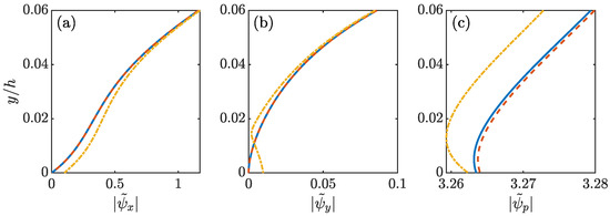 The amplitude of (blue solid lines), (red dash lines), and (yellow dash dot lines) in the near wall region of . Subplots from left to right are (a) the streamwise response mode , (b) the spanwise response mode and (c) the pressure response mode . Parameters are , , .