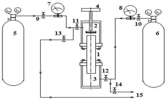 Experimental methods involved the implementation of certain procedures described, for example, in [17]. After evacuating the upper 2 and lower 3 flasks with the channel 1 connecting them with the valve 4 closed, the gases under study were fed into the diffusion cell. The upper flask 2 should be filled with a gas mixture of hydrogen and carbon dioxide from cylinder 5 through the opening of valves 9 and 11. Valve 13 must be closed. Pressurisation of the upper flask 2 was carried out up to the pressure of the experiment and was controlled by the manometer 7. After reaching the set pressure, valves 9 and 11 were closed. Similarly, the lower flask 3 was filled with nitrogen from the cylinder 6 through the open valves 10, 12 with the closed valve 14. The manometer 8 recorded the pressure of the experiment. Upon completion of the filling procedure, valves 10 and 12 were closed. Mixing of gases occurs when valve 4 is opened with synchronous recording of the mixing time. Valve 4 was closed at the end of the experiment. Then, the mixtures under study were fed through the outlets 15 to the chromatograph for analysis.