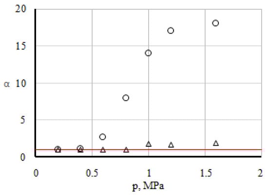 Analysis of the data, which is depicted in Figure 2, shows that diffusion is realised in the system in the pressure area of 0.1–0.6 MPa. This is evidenced by the equality to unity of the dimensionless parameter αi for all three components of the mixture under research. Starting from a pressure of 0.6 MPa, an increase in αi for all components in the system is fixed. Unusually significant increase was noted for CO2 and to a lesser extent for the most diffusionally mobile H2. Apparently, the pressure p* ≥ 0.6 MPa provides a change in the transfer mode from diffusion to convective. Further increase of pressure leads to an increase in the intensity of convective currents. This mixing is not typical for diffusion, in which the mixing intensity decreases with increasing pressure. The highest values of αi for CO2 at pressures exceeding the transition pressure indicate that under the given conditions there is a predominant transfer of CO2. With a further increase in pressure, the linear dependence is violated and the mixing intensity of the component behaves in a non-monotonic manner.