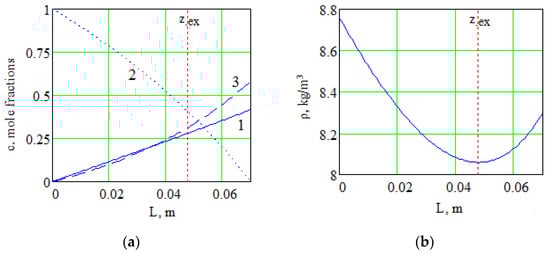 Solution of the system of Equation (7) numerically makes it possible to obtain the distribution of component concentrations along the diffusion channel and the distribution of the mixture density. Figure 4 shows the distribution of the density of the mixture under consideration and the concentration of components along the length of the channel at a pressure of 0.775 MPa, which determines the transition of the system from one kinetic regime to another one. The value of the extremum coordinate in the channel corresponds to zex = 0.0478 m.