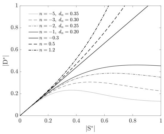 the function defined in (8) is monotonically increasing and thus invertible as . On the other hand, if and , the relation (8) is no longer monotone and cannot be rewritten in the form . In Figure 1, we plot the constitutive relation (8) with , , and for different values of the index n. As one can see, the monotonicity is lost for for which .