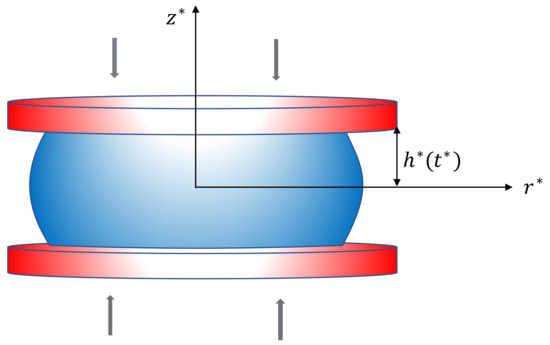 We considered a portion of fluid squeezed between parallel disks of radius placed at a distance ; see Figure 2. We assumed that the plates squeezed the flow so that , and we also assumed azimuthal symmetry so that there was no dependence on the angular coordinate . We defined as the initial position of the upper plate and assumed that: