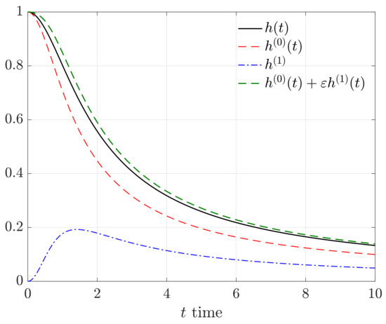 In this section, we show the contours/plots of the main variables involved in the problem for a given squeeze function . We did not have in mind any practical application; our intent was to give the reader an idea of the behavior of the system for different choices of the model parameters. We also observed that it was possible to extend our analysis to higher orders (second, third, etc.) to get a finer approximation of the solution. The procedure remained the same with the calculations becoming more involved.