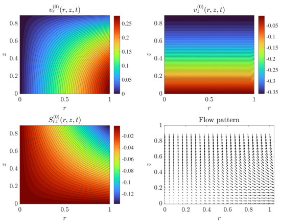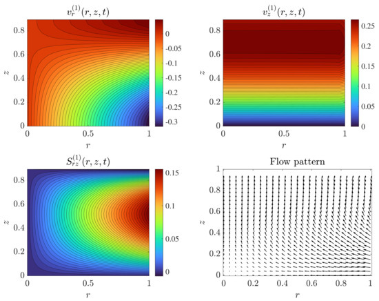 In Figure 4, we plot the contours of the velocity components, the contours of the tangential stress, and the flow pattern at the leading order. The parameters used in the simulations were the ones of Table 1. Time was set to so that . As physically expected, the modulus of the shear stress was maximum in the vicinity of the upper right corner of the domain, while it vanished on the axes and . The radial velocity decreased with z and increased with r, whereas the vertical velocity was almost uniform on . In Figure 5, we show the velocities , and the stress still using the parameters of Table 1. We noticed that the radial velocity was negative (directed towards the center ) except in the proximity of the axis and near the plate. As a consequence, the radial velocity at the zero order was slightly larger than that obtained at the first order (the correction at the first order was negative almost everywhere). Recall that the first-order radial velocity is given by .