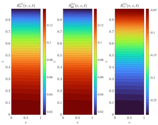 The stress was positive almost everywhere and reached its maximum at the external surface , showing that the modulus of the shear stress at the first order was slightly smaller than the one at the zero order (recall that the shear stress at the leading order was negative everywhere). The normal stresses at the zero order were null, so we plot only , , and ; see Figure 6. It is interesting to notice that the components and were identical. This was observed also for other choices of the parameters. Notice also that the moduli of the normal stresses were maximum on .