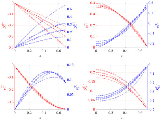 The solution at the first order is therefore completely determined by the solution at the leading order. Notice that, as it occurs at the leading order, the radial velocity is linear in r and does not depend on z, whereas the vertical velocity is linear in z and does not depend on r. Recalling (37), (38), and (54)–(57), we found: