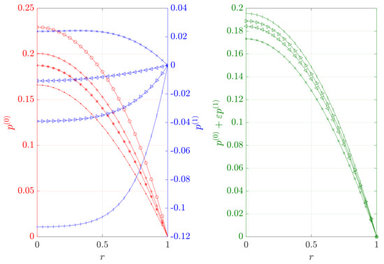 In Figure 7, we plot the shear stress, velocity components, and normal stresses at and (so that ) for the indices and for . The parameters here were (no-slip), , , and . These plots allowed us to study the dependence of the main variables on the index n. Looking at the shear stress plot, we noticed that and exhibited opposite monotonicity (with respect to z) irrespective of n. In particular, we noticed that at the leading order, the increase of n resulted in a decrease in the modulus of the shear stress, so that the shear between adjacent layers was reduced. This was probably due to the fact that the fluid shear thinned as n was increased. The velocity components , for exhibited a less pronounced variation with respect to n. The velocities were decreasing functions of z with being negative for each z (as expected). The normal stresses were monotonic functions of z with decreasing with z and increasing with z. We then illustrated the dependence of the pressure on n at time . In Figure 8, we show the pressures and and the pressure at the first order at time . The parameters are the same as Figure 7. We noticed that whereas decreased with n the pressure, actually increased with n except for (where the variation with r was very small). The pressure at the leading order (green) decreased with n, showing that the correction did not vary the monotonicity of the pressure at the leading order. This behavior was again in accordance with the fact that shear-thinning effects were enhanced as n increased. Notice finally that in all the plots, the Newtonian-like behavior was the one in which .
